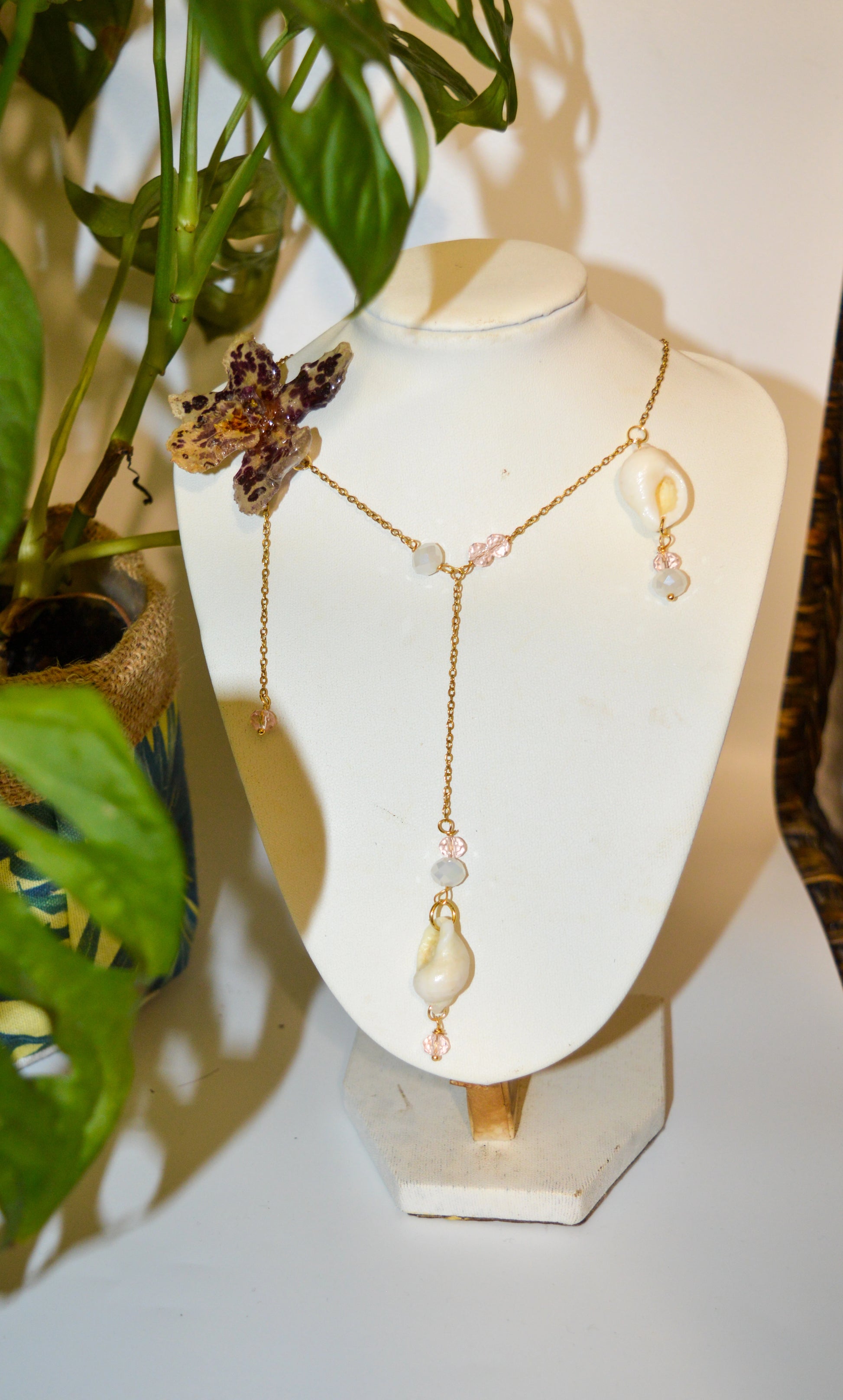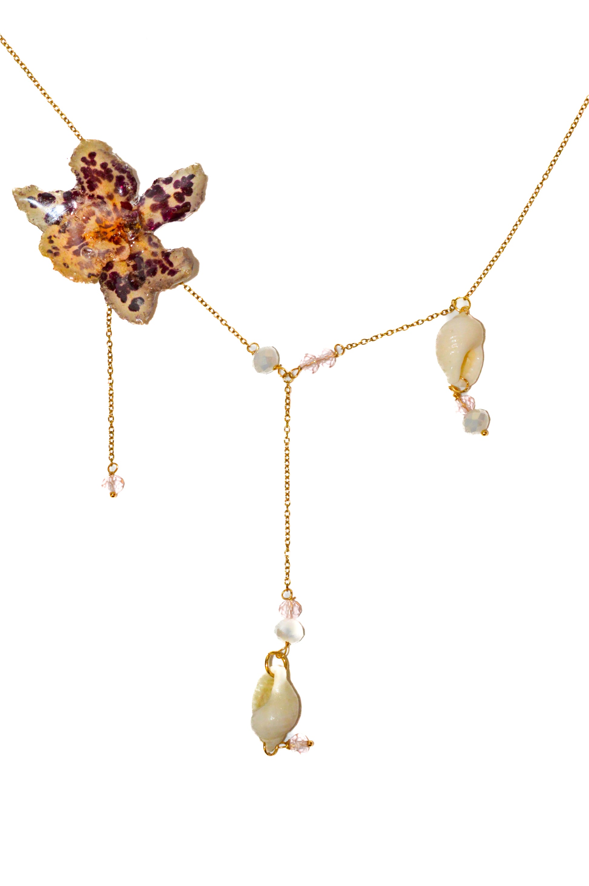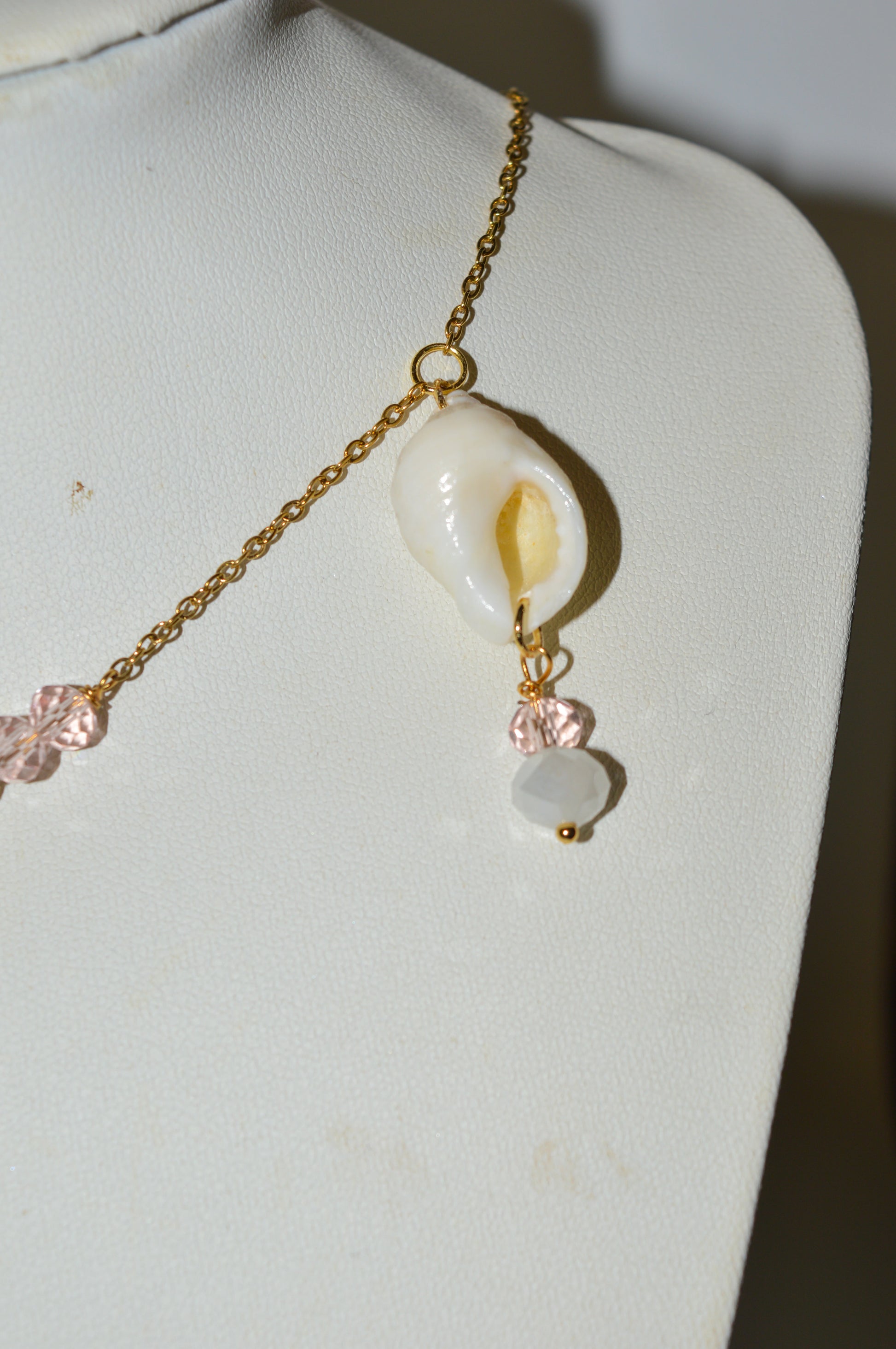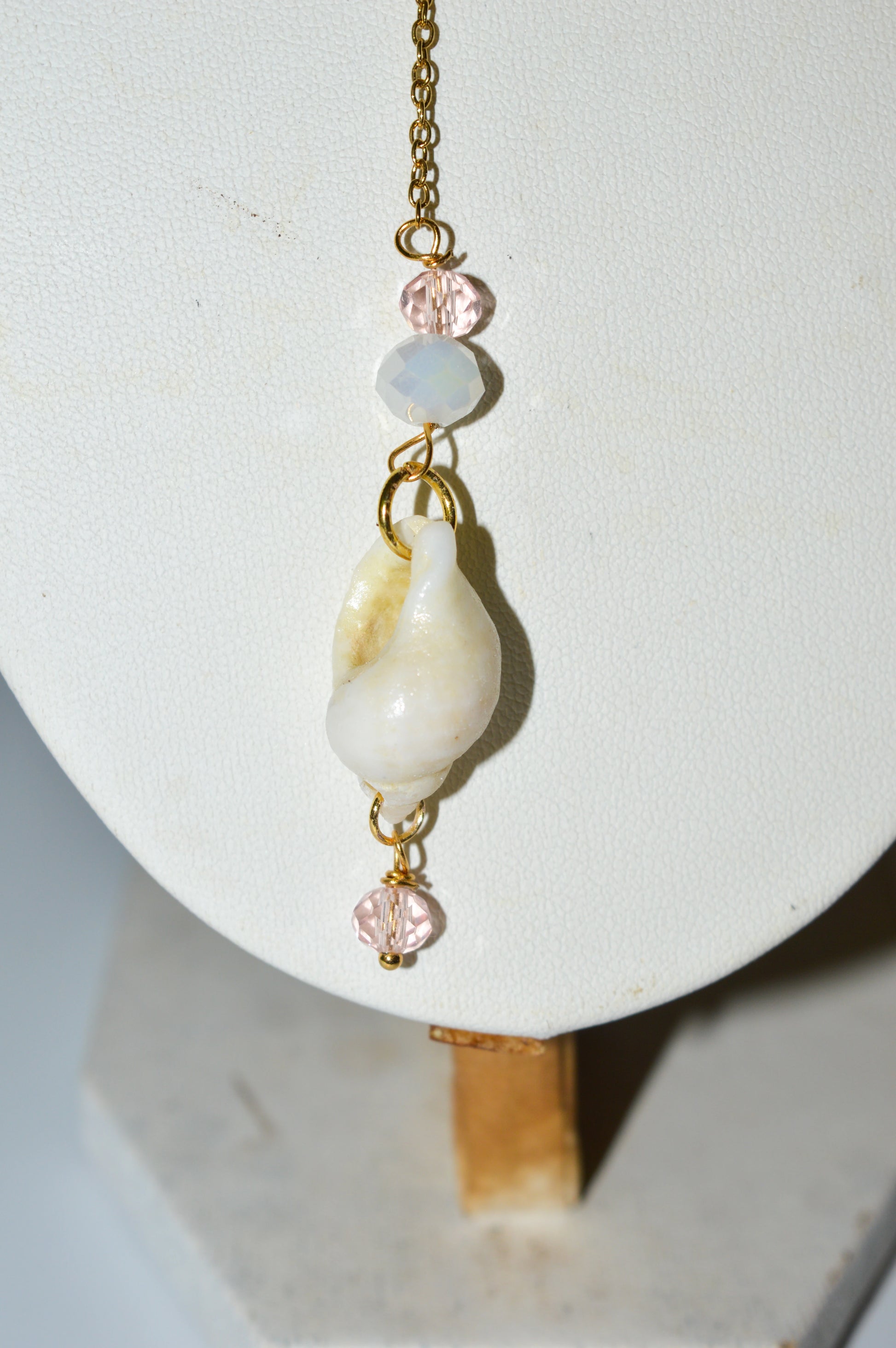 Materiales: cristal facetado blanco y rosa, caracolas naturales de las playas de España
